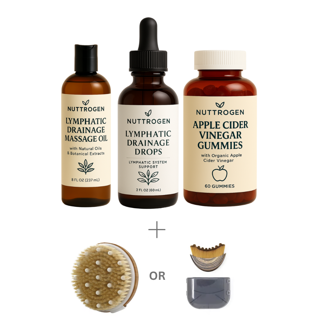 Our 4-in-1 Detox Bundle combines Lymphatic Drainage Drops, Massage Oil, and Apple Cider Vinegar Gummies to help flush toxins, ease bloating, and kickstart your metabolism — all in one simple daily ritual.